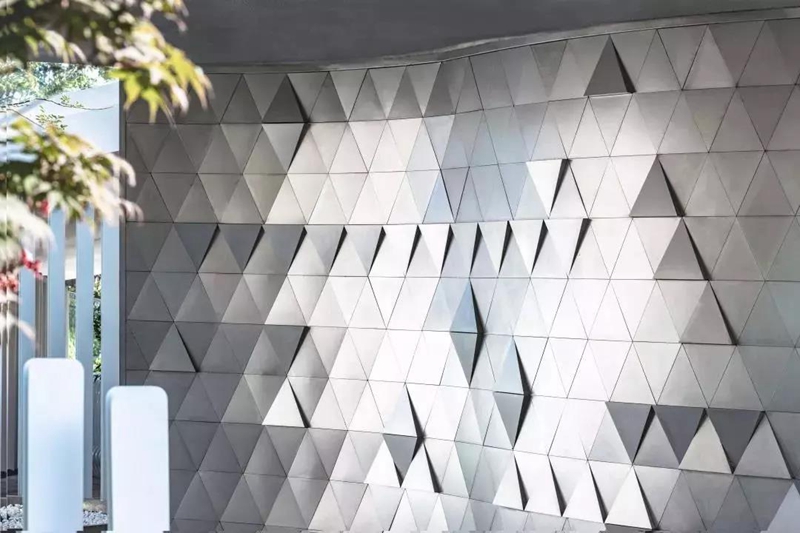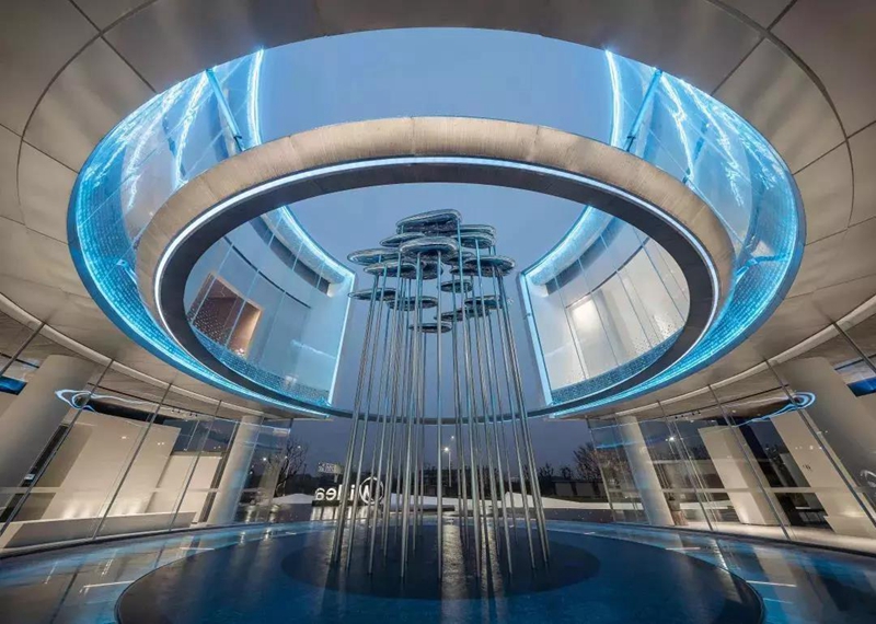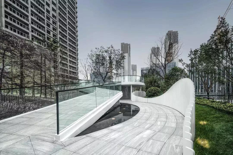 項目分為兩個板塊,前場是極具未來感的鏡面水景,后場則是生活化的景觀空間,把人從室內(nèi)引向室外。