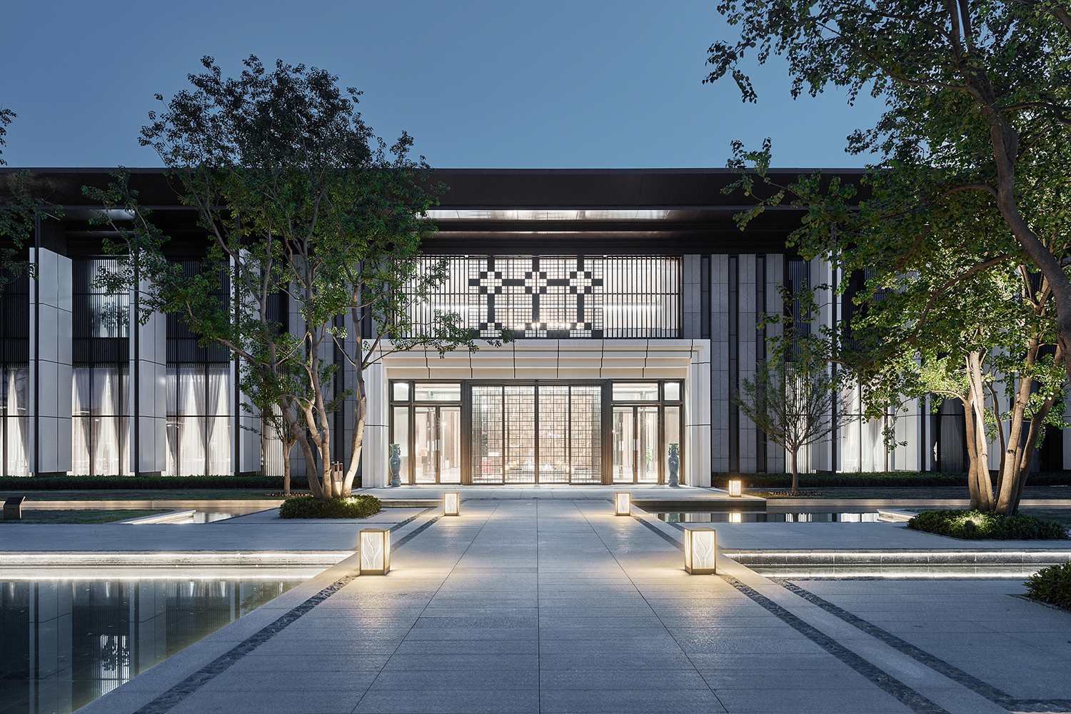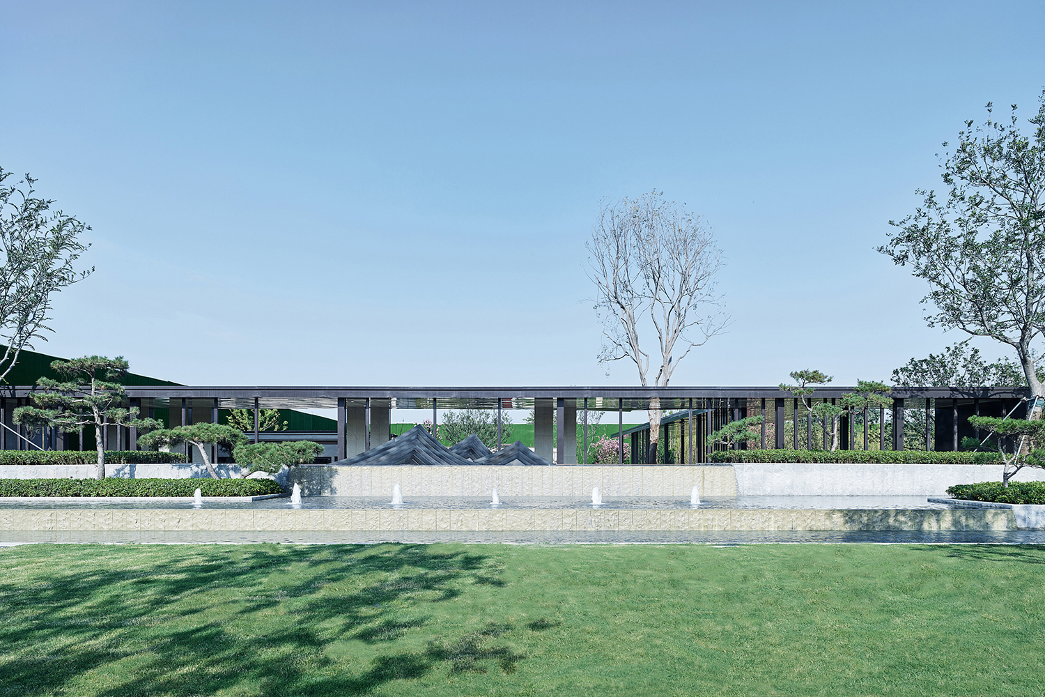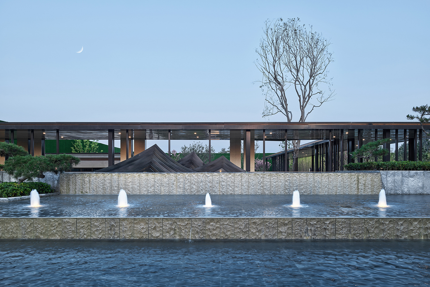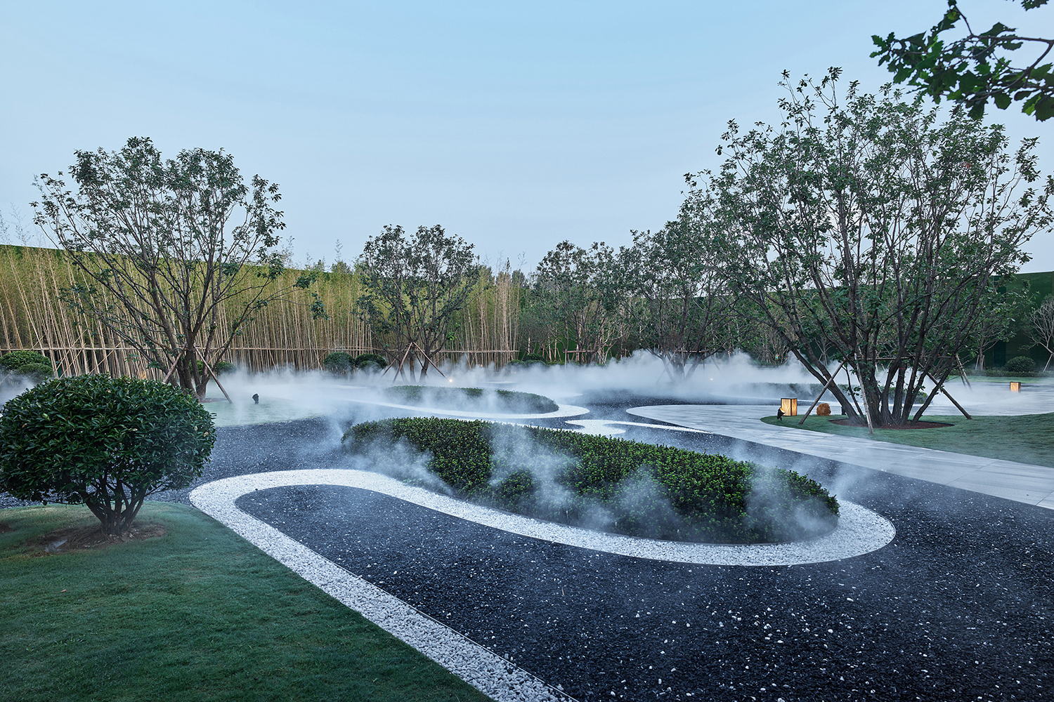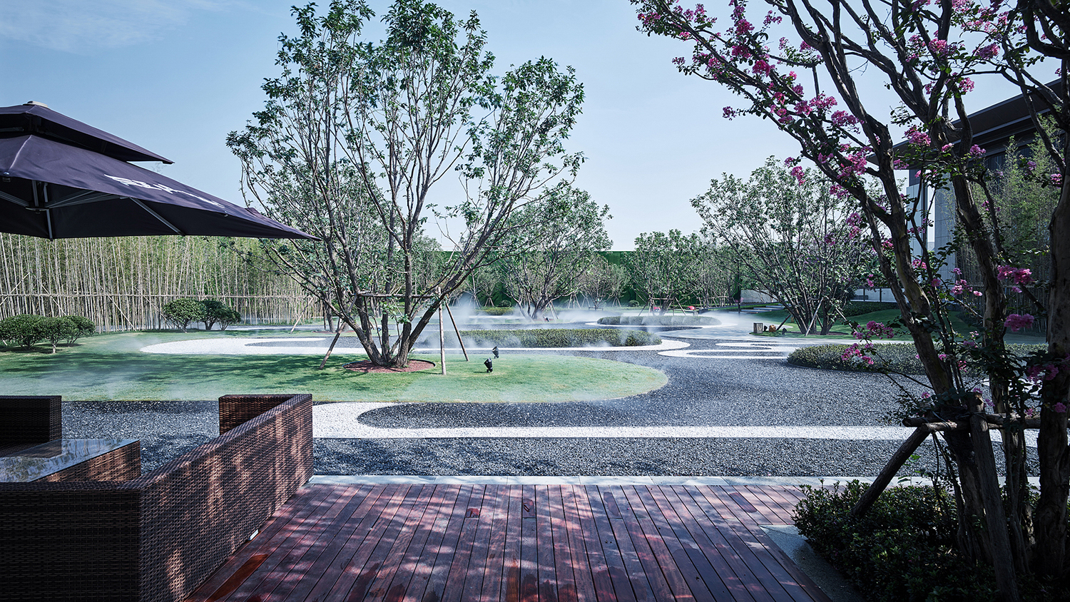 坤達·江山筑,樹影清暉,云靄繚繞;以疏朗飄渺的姿態,追尋中式園林中的逸興遄飛和山水之意。