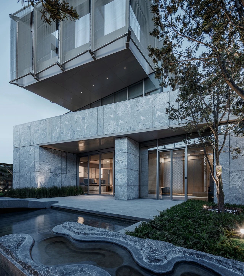 特選的中式黑松搭配精心打磨而出的山水紋理石材,裁剪出光與影。中式疊水設計,讓樹影投射與墻、地、水三面,姿態各異,景觀空間的風格感躍然紙上,讓居者提前感受到如著名文學家林語堂筆下理想的住宅體驗“園中有院,院中有樹,樹上見天,天中有月”的生活意境。